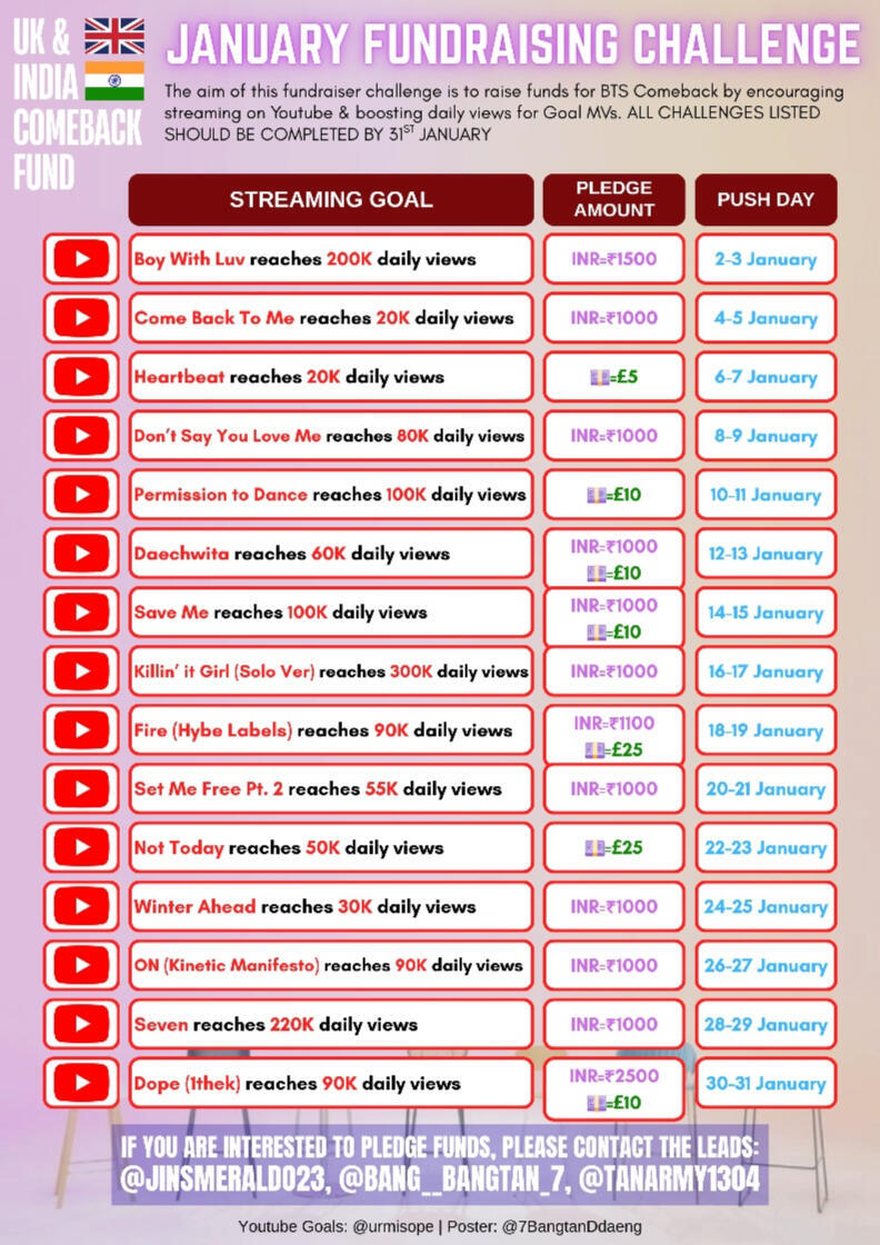YouTube is one of our most crucial resources during a comeback, but our views lately could do with a boost.In order to help with this and raise money for the comeback some amazing army have created a YouTube Fundraising Challenge. If we achieve the YouTube streaming goals set above, the money pledged will be donated to the UK and Indian comeback funds!! πHere are some playlists you can use for today, every few days the focus video changes, so we'll keep these links updated daily with the correct playlists. Right now the focus is HeartBeat.